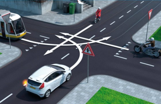 Resim F:  Beyaz hatchback araç bizim aracımız olsun. sarı baklava dilimli levha bize dönük ve ayrıca levha altında sola dönüşte önceliklidir diyor. diğer  karşımızdaki turuncu moped ve sağımızdaki kırmızı motosikletli  her ikisinde de  köpek balığı dişi çizgisi yani bekle çizgisi var. bu durumda ilk beyaz araç yani biz geçiyoruz. daha sonra kırmızı motosikletli aracın sağından gelen turuncu mopedli geçiyor ( her ne kadar dümdüz devam etse de hollanda da kural bu şekilde ... ) en son ise kırmızı motosikletli geçiyor.